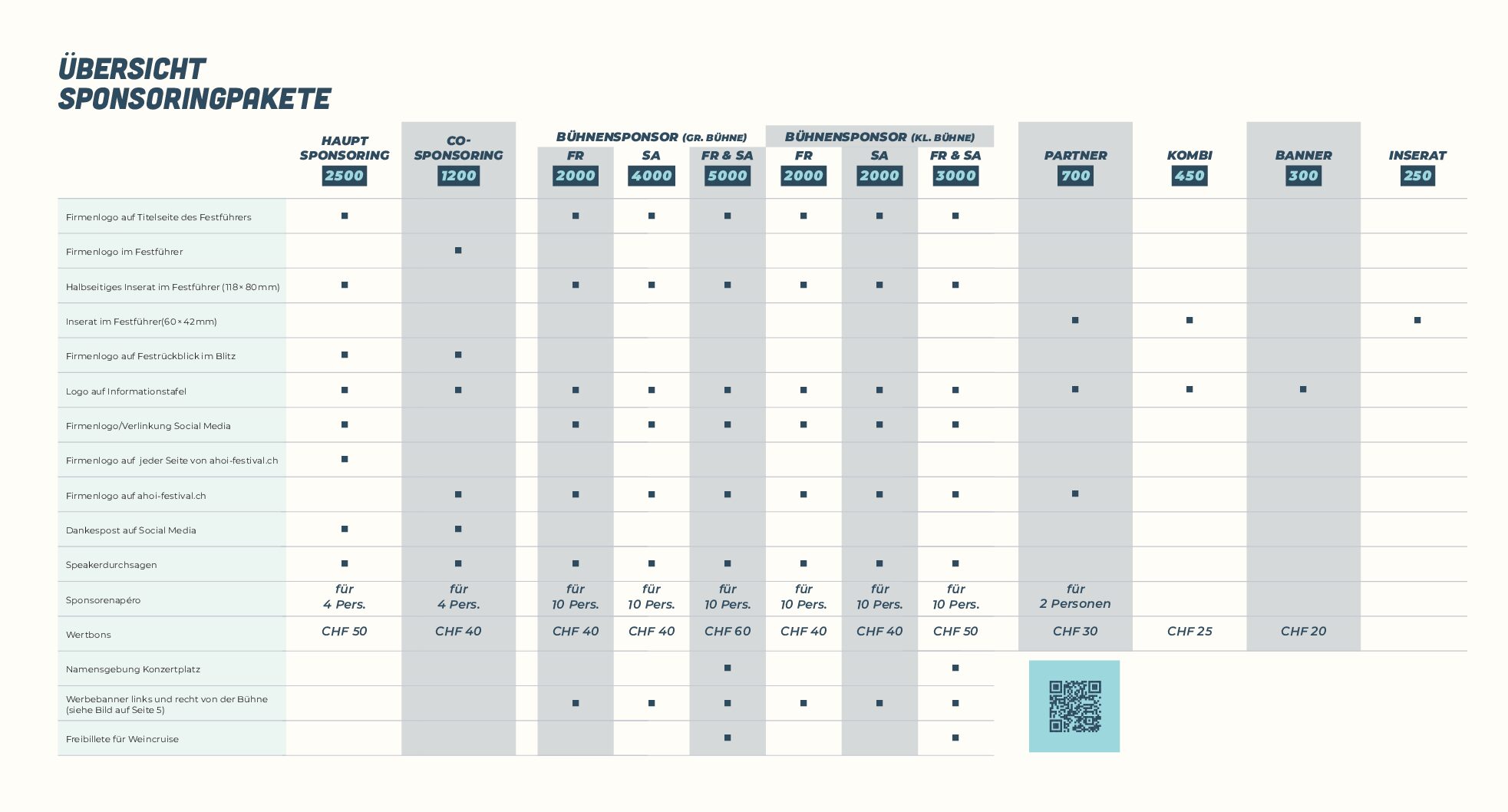 Dank der steigenden Qualität hat das Fest „AHOI“ in den letzten Jahren an Bekanntheit und Beliebtheit gewonnen. Mit dem neuen Namen bietet sich Ihnen die Möglichkeit, Ihr Unternehmen stilvoll ins Rampenlicht zu rücken. Die Sponsorenpräsenz wird künftig dezent und gezielt auf die Besuchenden ausgerichtet: Statt Blachen Werbung kommen elegante Banner und Informationen auf Tafeln zum Einsatz.